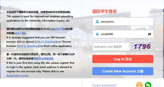 Username: Passport Number, initial password is JJUat0086. After entering the system, click "在校(current student" in the upper right part to see all the functions of current students.